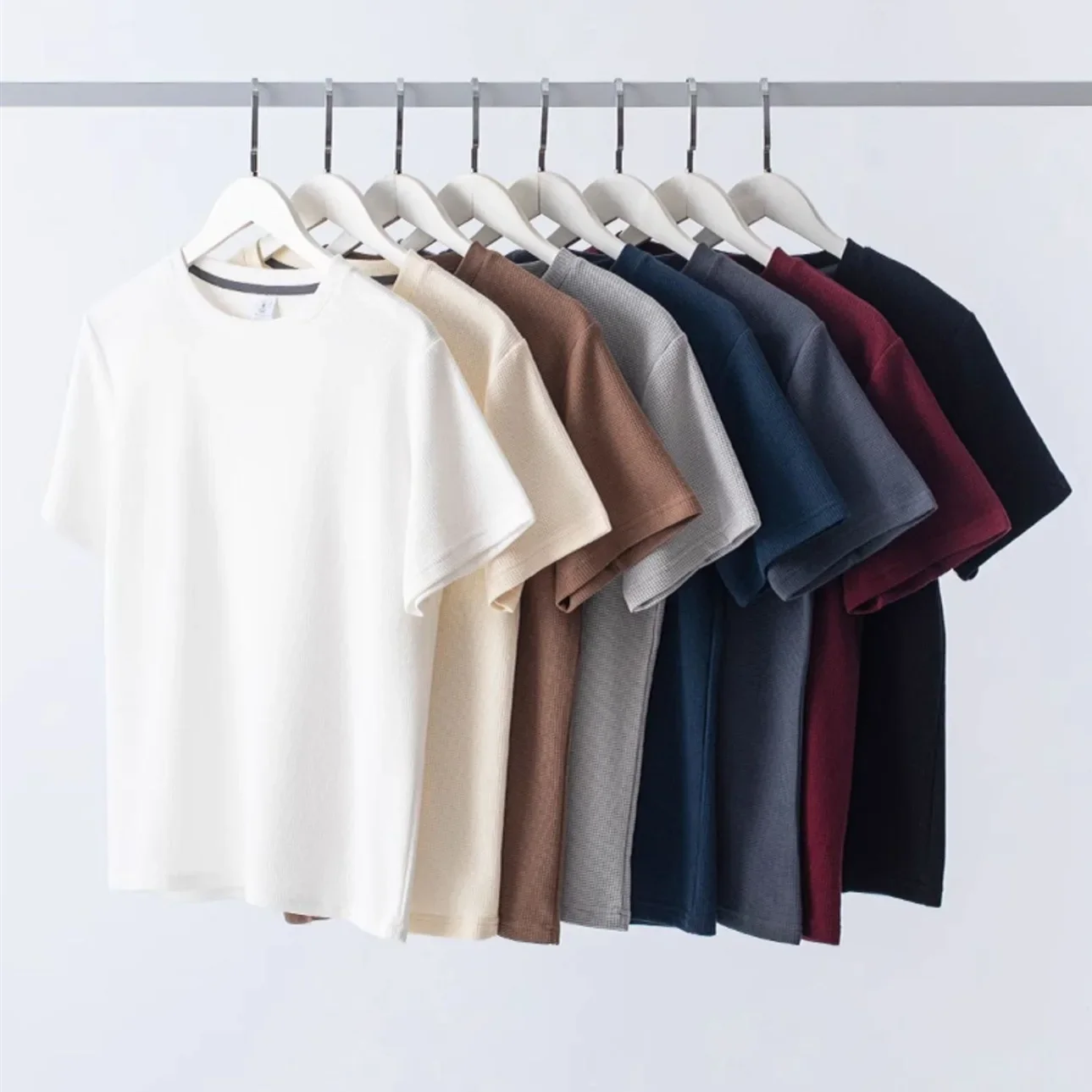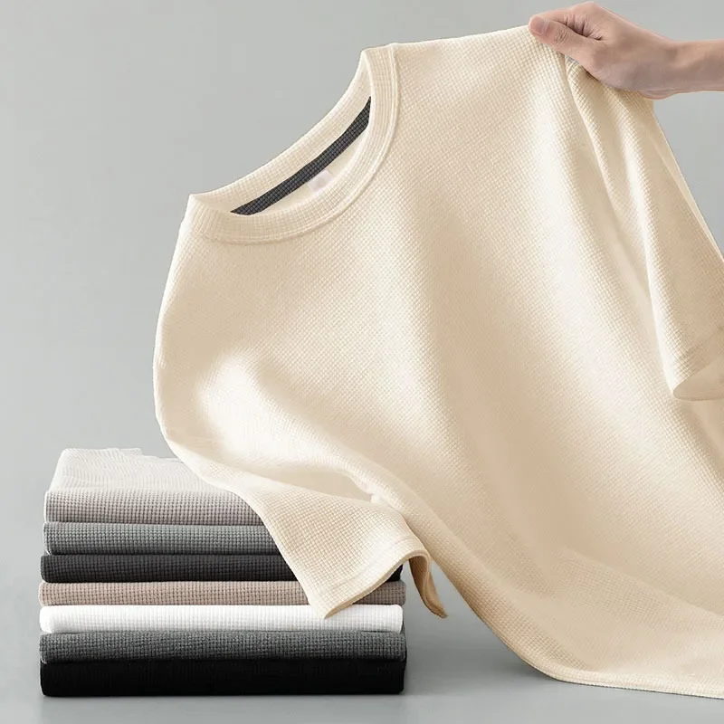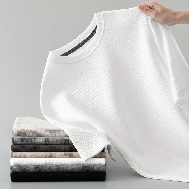 Men Summer T-Shirt Man Short Sleeved Waffle Solid T-Shirt Male Solid Color Casual Tee Round Men's Round Neck Fashion To