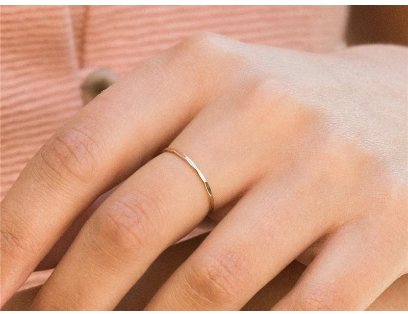These rings feature subtle punk-edge detailing with a delicate hammered texture, adding a unique touch without compromising their minimalist aesthetic. The round contour fit ensures comfortable wear from knuckle to base, adapting seamlessly to your finger. Their bridal-ready versatility makes them an ideal choice for weddings, parties, or as a sophisticated addition to your everyday jewelry collection. They are perfect for bohemian-inspired looks or simply adding a refined layer to any outfit.